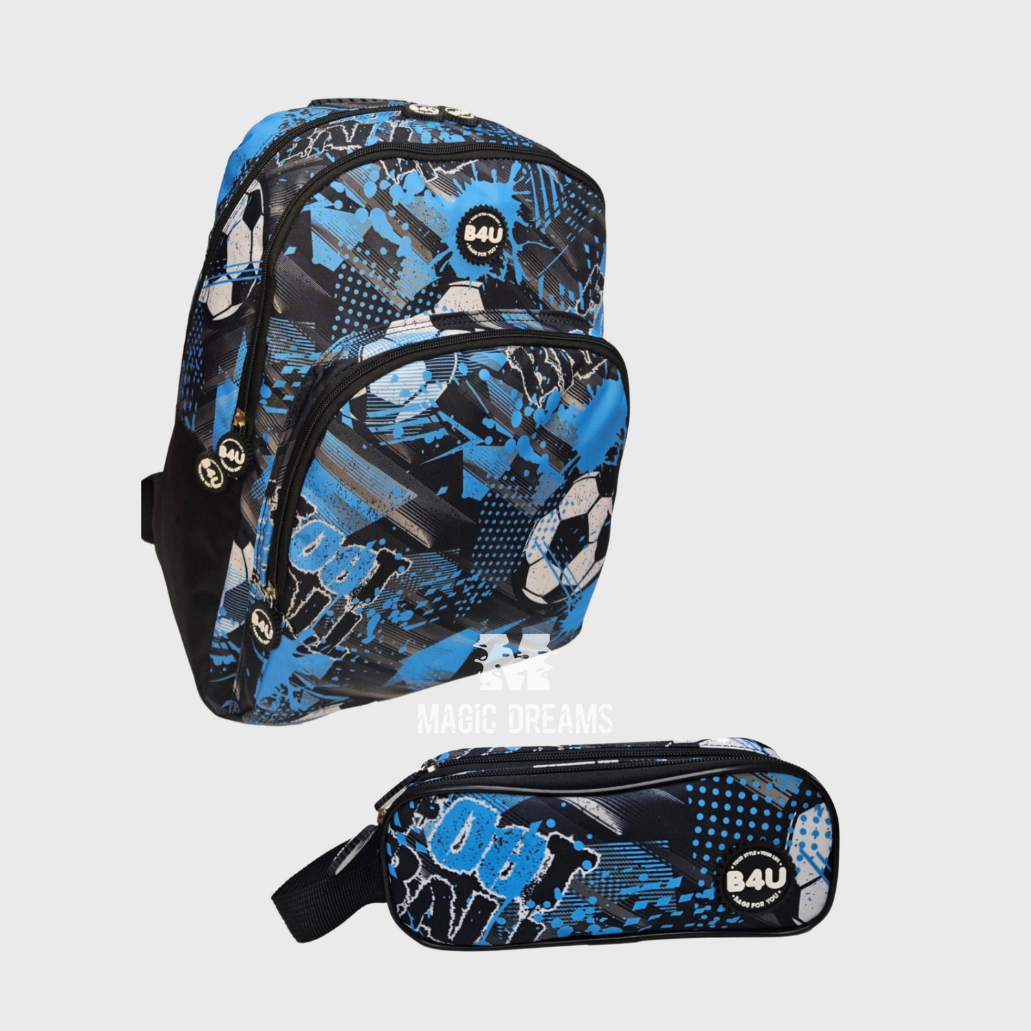 Conjunto Escolar Mochila Football com Estojo Duplo B4U para os apaixonados pelo futebol.